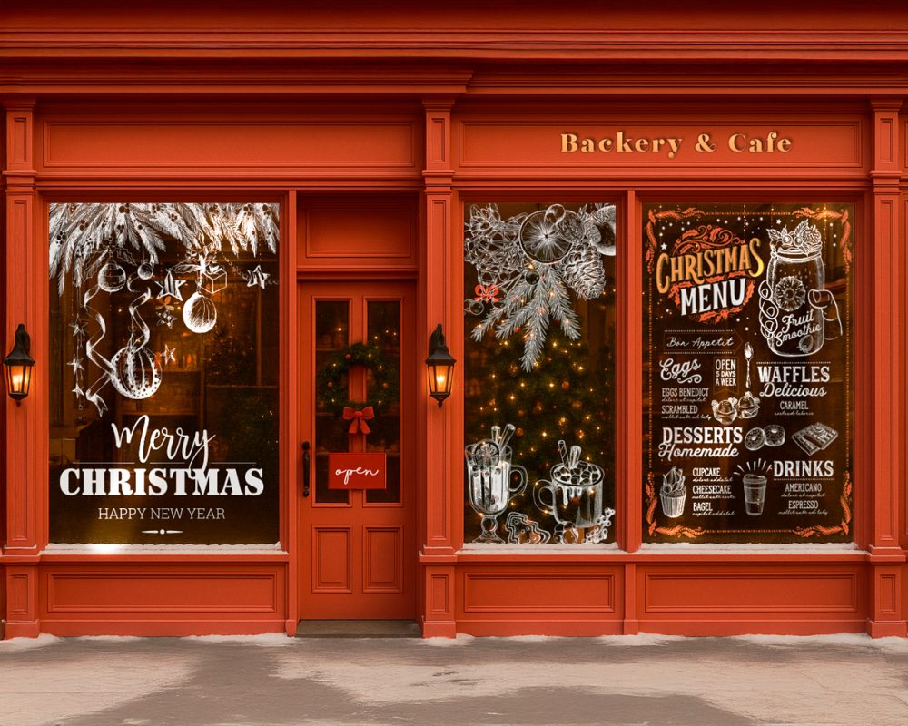 Choose frosted window decals. They create a cozy frosted-glass effect without overwhelming the storefront. Snowy edges, soft winter scenes, or frosted lettering instantly elevate the atmosphere.
