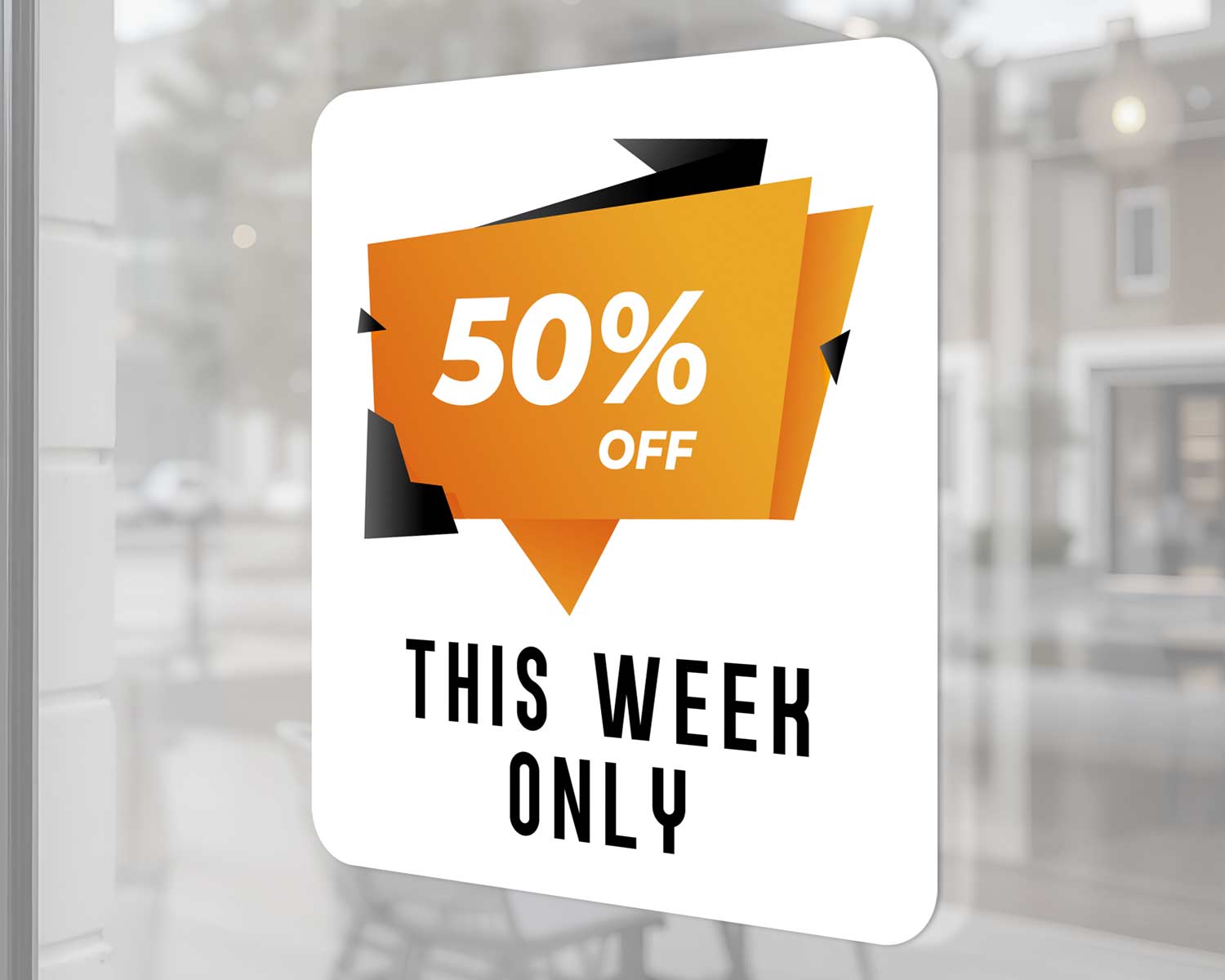 Make use of easy-to-apply, repositionable store signs for short-term promotions. Ideal for frequently updated messaging.