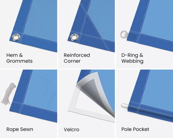 Explore different installation methods to find the right fit for your specific needs. We suggest hems and grommets for easy hanging, pole pockets for vertical displays, reinforced corners for maximum strength, and much more.
