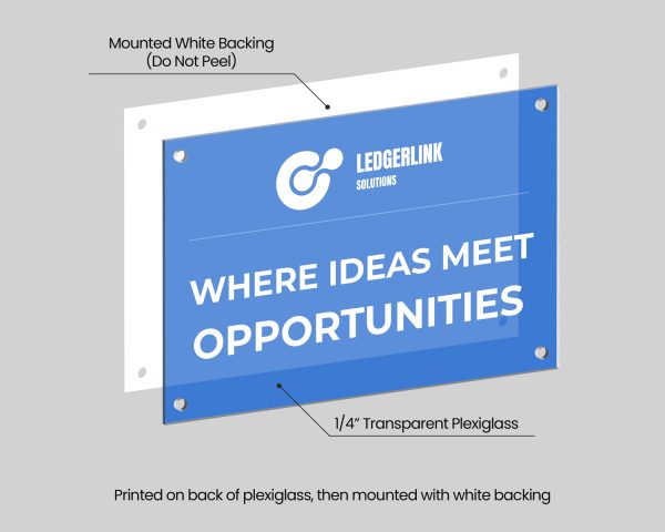 Custom acrylic signs are made from premium-quality ¼” clear plexiglass, a resilient substitute to glass, with a white backing layer. They feature pre-drilled holes and come with standoffs at 1” diameter for easy mounting. The display comes in three sizes: 16”x24”, 20”x30”, and 24”x36”.